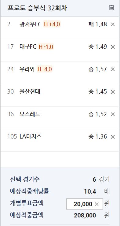 대구FC vs 라이언 시티 1.10-6.20-12.50 일 때 6승 1무 0패// -1.0핸승 적중 기대 확률 58.39% - 적중 실패