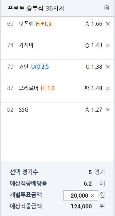 닛폰햄 vs 라쿠텐 2.24-1.45 일 때 17승 1무 22패, NPB 기준으로 1승 1무 1패// 프로토 기준 +1.5핸승 기대 확률 52.41% - 적중
