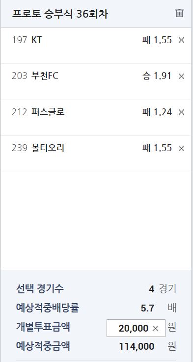 부천 vs 부산 1.91-3.10-3.45 일 때 1승 0무 0패// 프로토 기준 부천 승리 기대 확률 45.55% - 적중