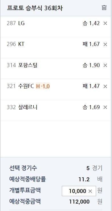 수원FC vs 인천 2.34-2.90-2.75 일 때 2승 1무 1패// 프로토 기준 -1.0핸패 기대 확률 59.18% - 적중