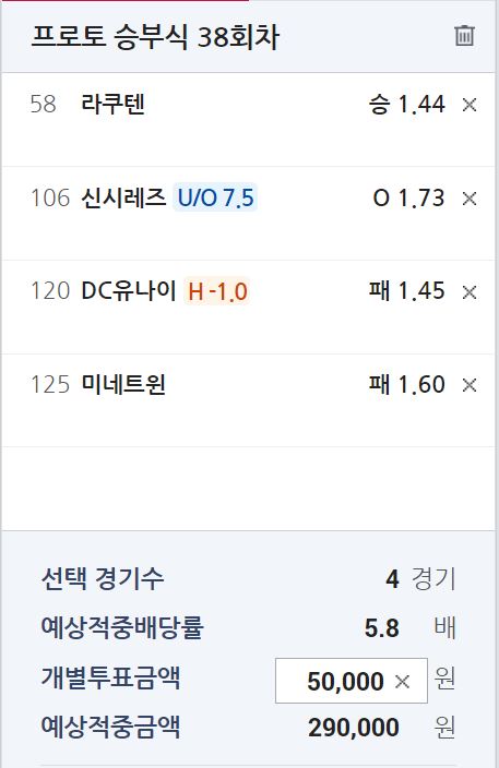 미네소타 vs 휴스턴 1.96-1.60 일 때 MLB 기준으로 14승 14패// 프로토 기준으로 휴스턴 승리 기대 확률 54.38% - 적중