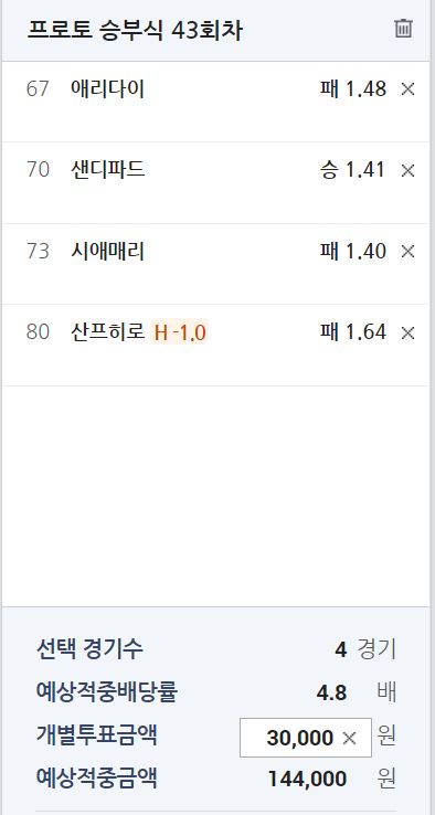 산프레체 히로시마 vs 나고야 그램퍼스 1.94-2.95-3.55 일 때 0승 0무 1패 // 프로토 기준 -1.0핸패 기대 확률 53.66%