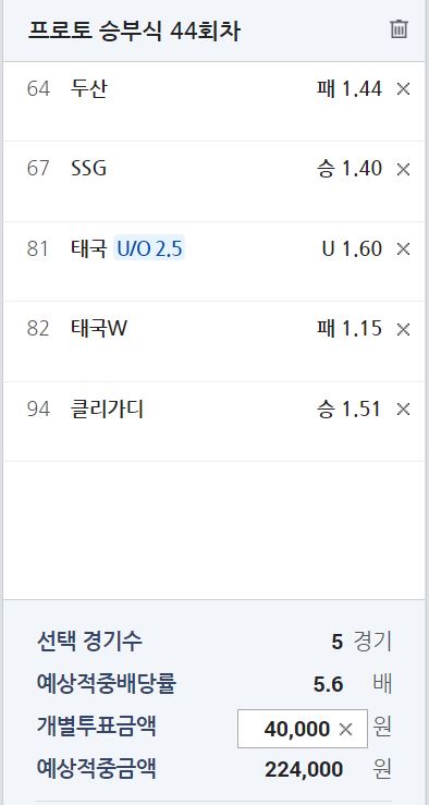 SSG vs KT 1.40-2.37 일 때 KBO 기준으로 5승 2패// 프로토 기준 SSG 승리 기대 확률 62.86% - 적중 실패