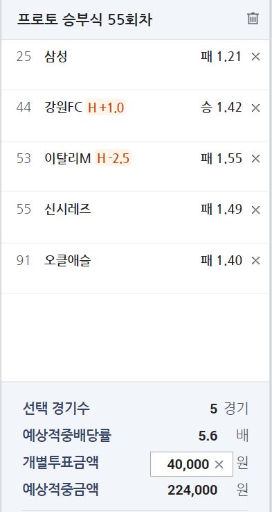 강원 vs 김천 2.50-3.15-2.39 일 때 1승 4무 0패// 프로토 기준 +1.0핸승 기대 확률 62.68%