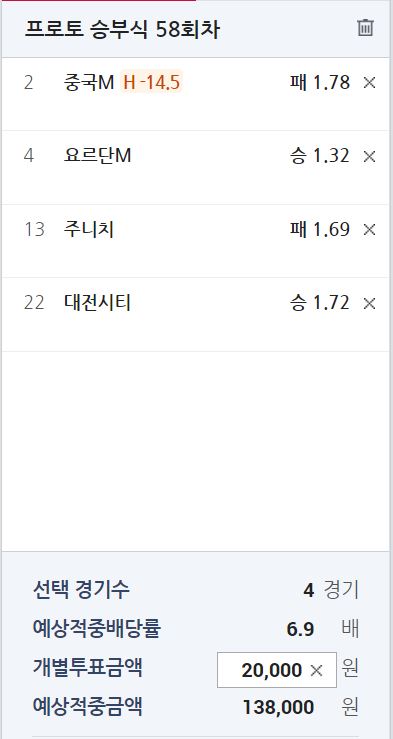 중국 vs 인도네시아 1.01-7.49 일 때 21승 3패// 프로토 기준 -14.5핸패 기대 확률 50% - 적중 실패