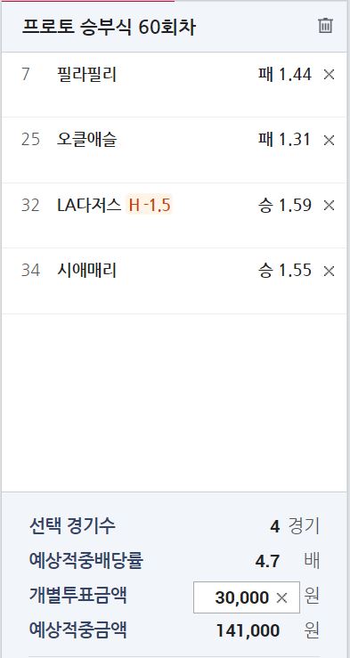 필라델피아 vs 애틀랜타 2.33-1.44 일 때 5승 7패// 프로토 기준 애틀랜타 승리 기대 확률 61.81% - 적중 실패