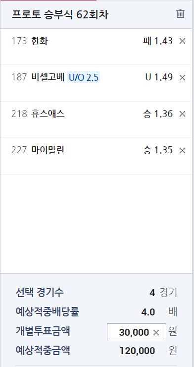 한화 vs KIA 2.36-1.43 일 때 2승 8패// 프로토 기준 KIA 승리 기대 확률 62.24% - 적중
