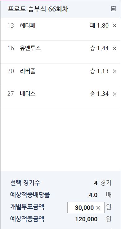 베티스 vs 엘체 1.34-4.15-6.70 일 때 기록은 없음// 프로토 기준 베티스 승리 기대 확률 66.42% - 적중