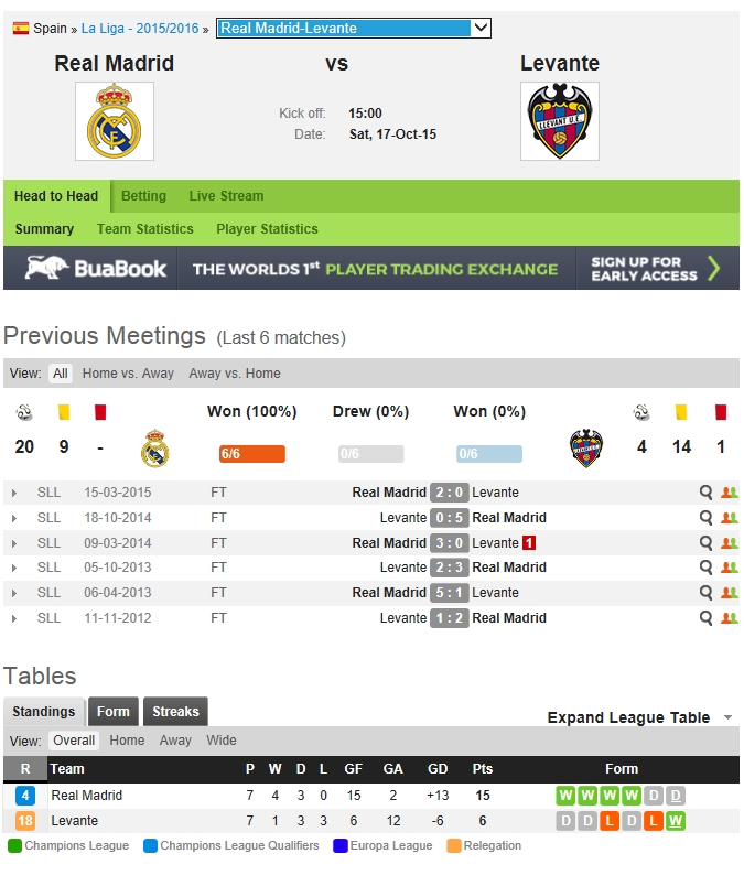 레알 마드리드는 4일 아틀레티코 마드리드와 라이벌전에서 1-1로 비겼다. 레알 마드리드는 최근 리그 2경기에서 연속 무승부를 기록했다. 그러나 레알 마드리드는 홈경기에서 20경기 연속 무패 행진을 이어가고 있다. 레반테는 4일 비야레알과 홈경기에서 1-0으로 이겼다. 리그 7경기 만에 첫승이다. 하지만 레반테는 원정 경기에서 약하다. 지난 19번의 원정경기에서 단 2승만 거뒀다. 최근 전적에서는 레알 마드리드가 6승으로 압도적 우세.